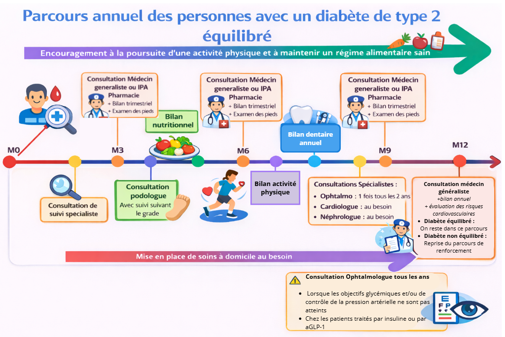 Le second parcours s’adresse aux patients dont le diabète est équilibré. Il est plus léger en termes d’interventions et repose principalement sur des consultations de suivi. Ces consultations permettent de faire le point régulièrement, de vérifier que les recommandations sont bien suivies et d’ajuster la prise en charge si nécessaire, afin de maintenir un bon équilibre de votre diabète dans la durée.